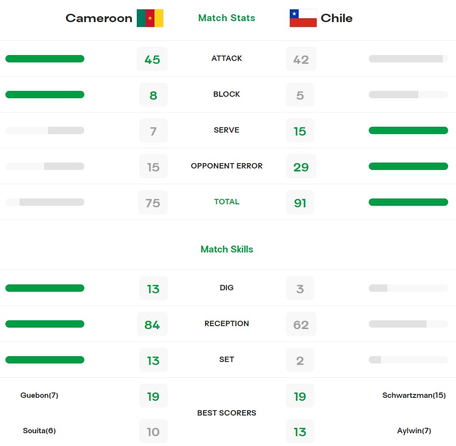 Les Lionnes U19 du Volleyball Camerounais perdent leur cinquième match de la compétition contre une équipe du Chili qui avait sensiblement le même niveau de jeu. A ce stade, la Chine, la Turquie et les Etats-Unis sont les équipes invaincues en match de poule.
